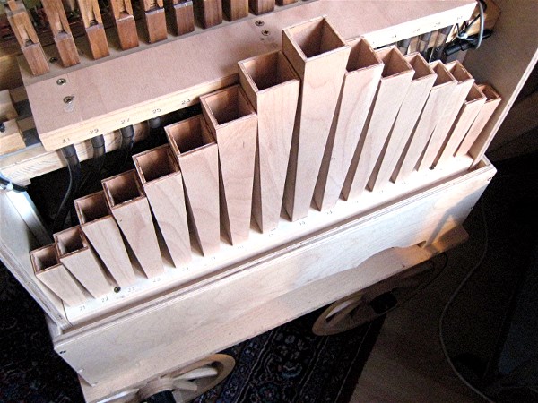 In der Vorbereitung für das Trompetenregister musste unerwartet eine größere Reihe von Experimenten gemacht werden, die letztlich zu der etwas ungewöhnlichen Form führten.