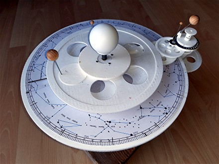 Es gibt die Möglichkeit, sich gedanklich von der Erde zu lösen und aus dem Weltraum einen Teil unseres Sonnensystems zu beobachten. Dabei steht im Zentrum die Sonne, die umkreisenden Planeten Merkur, Venus und Erde, dann Mars, Jupiter, Saturn, Uranus und Neptun u.v.a. Außerdem wird die Erde von ihrem Trabanten, den Mond umkreist. Die Stellung der Himmelskörper zueinander wird mit diesem Modell anschaulich. |